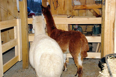 Isabelle and her friend brought the alpacas this morning and dropped them in their new home, then we all watched them for a hour or better while they became accustomed to their new abode. When we were sure that they were ok with everything, we left them to explore the stable and pasture area and went into the house to show Isabelle our knitting machine. She has been toying with the idea of getting one and wanted to see it and ask a few questions about what we thought of ours. We told her that it is a superior knitting machine and that you can make a knitted item in a very short period of time once you become familiar with the machine and using it. We gave her the DVD to take home to study, because she is planning on coming back to try the machine and bring her spinning wheel here for Vicki to try, because we want to get a wheel to spin our alpaca wool too.